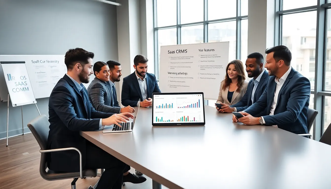 professionals collaborating on SaaS CRM software in a modern office.